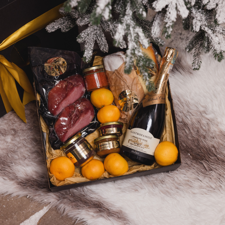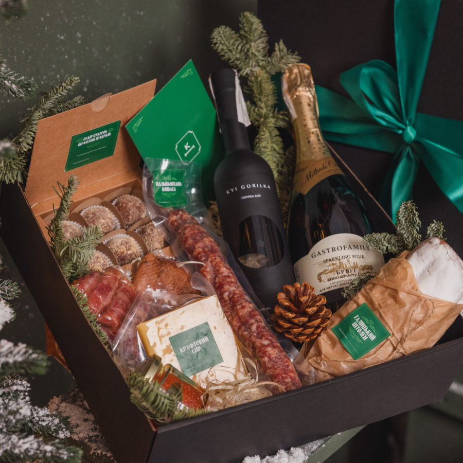 Пляшка ігристого брют Gastrofamily (0,75 л), галицький штолен (450 г), пальцьопхана ковбаса (170 г), крафтові настоянки від Канапи (6 шт. по 50 мл), авторські цукерки від шефа (90 г), крафтовий сир (200 г), крафтові конфітюри: вишневий гель, абрикос-чілі, варення із троянд (300 г), чай "Карпатський збір" (25 г), листівка з привітанням.