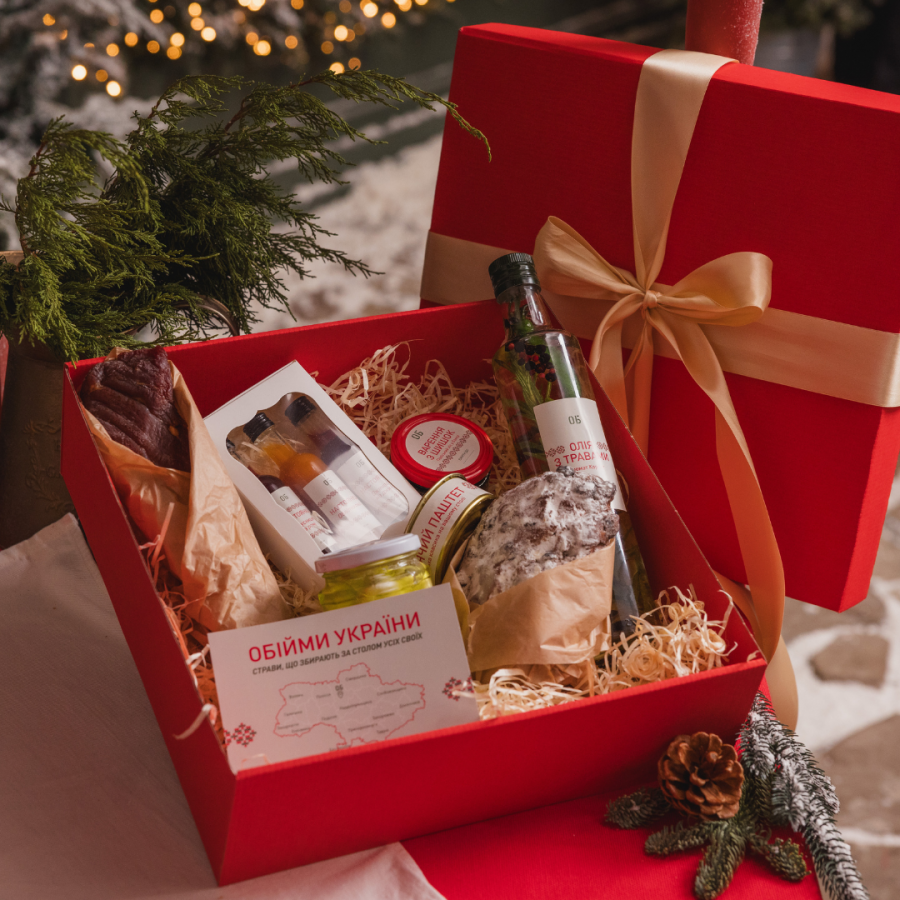 Галицький штолен з горіхами та цукатами (300 г), київський курячий паштет (100 г), південний сир лабне в домашній олії з травами (50 г), варення із поліських шишок (100 г), ковбаса чеман зі Сходу (300 г), карпатська олія з травами (500 мл), набір з трьох наливок "ТРИ СИЛИ" (брусниця на ромі, обліпиха і лжина на джині по 50 мл).